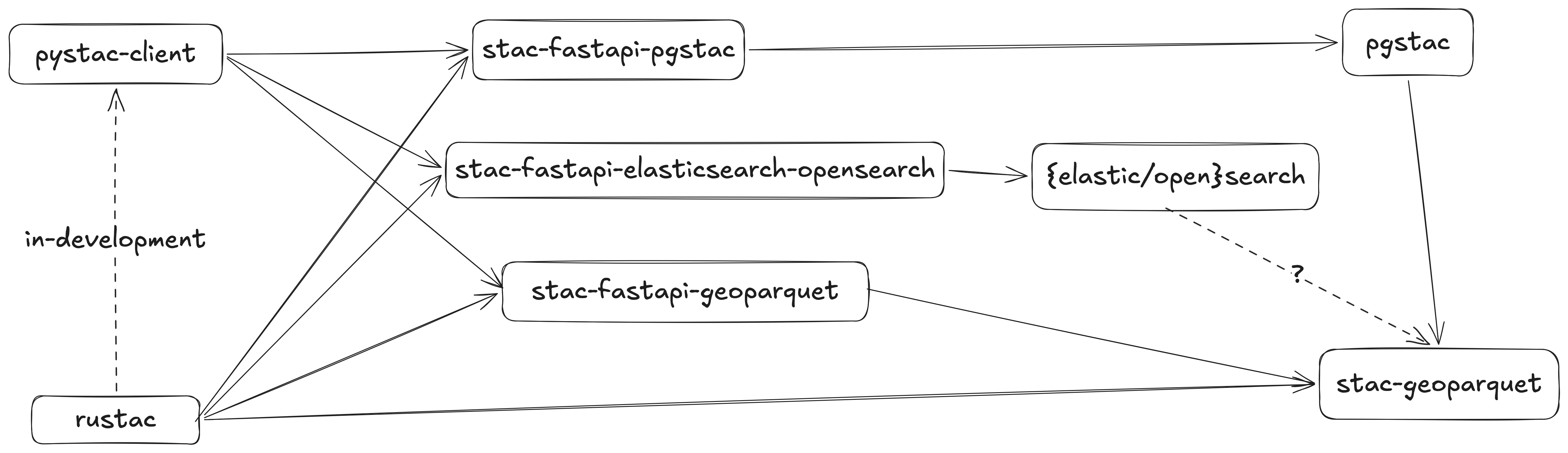 | stac-utils/rustac (née stac-rs) | Lower-level, Python and CLI, async, STAC search directly on stac-geoparquet files |